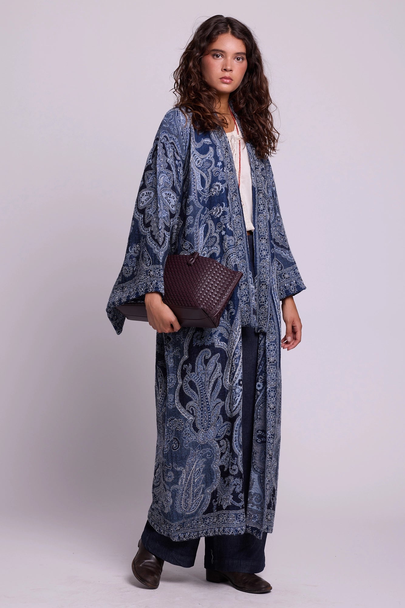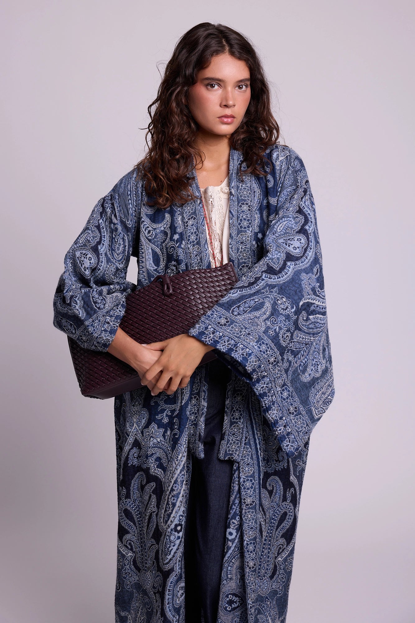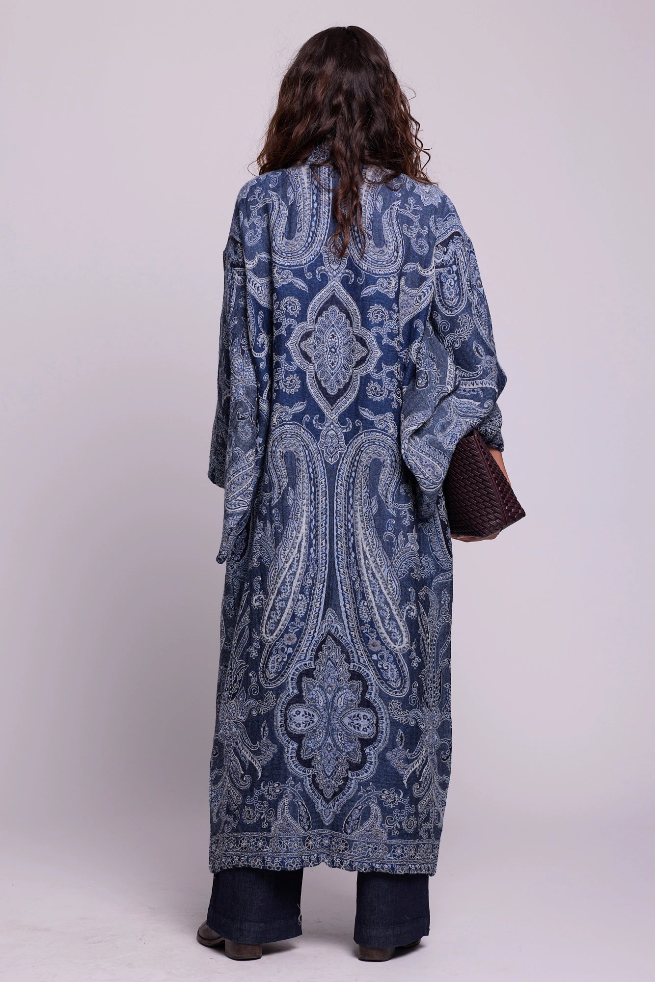 The Blue Paisley Kimono Coat, crafted from a pure wool shawl, is a celebration of refinement. Cloaked in deep indigo blues with intricate paisley detailing, it mirrors the serenity of twilight skies. Its fluid cut add understated drama, while the natural warmth of wool makes it both practical and elegant. A timeless piece that fuses heritage with modern luxury.