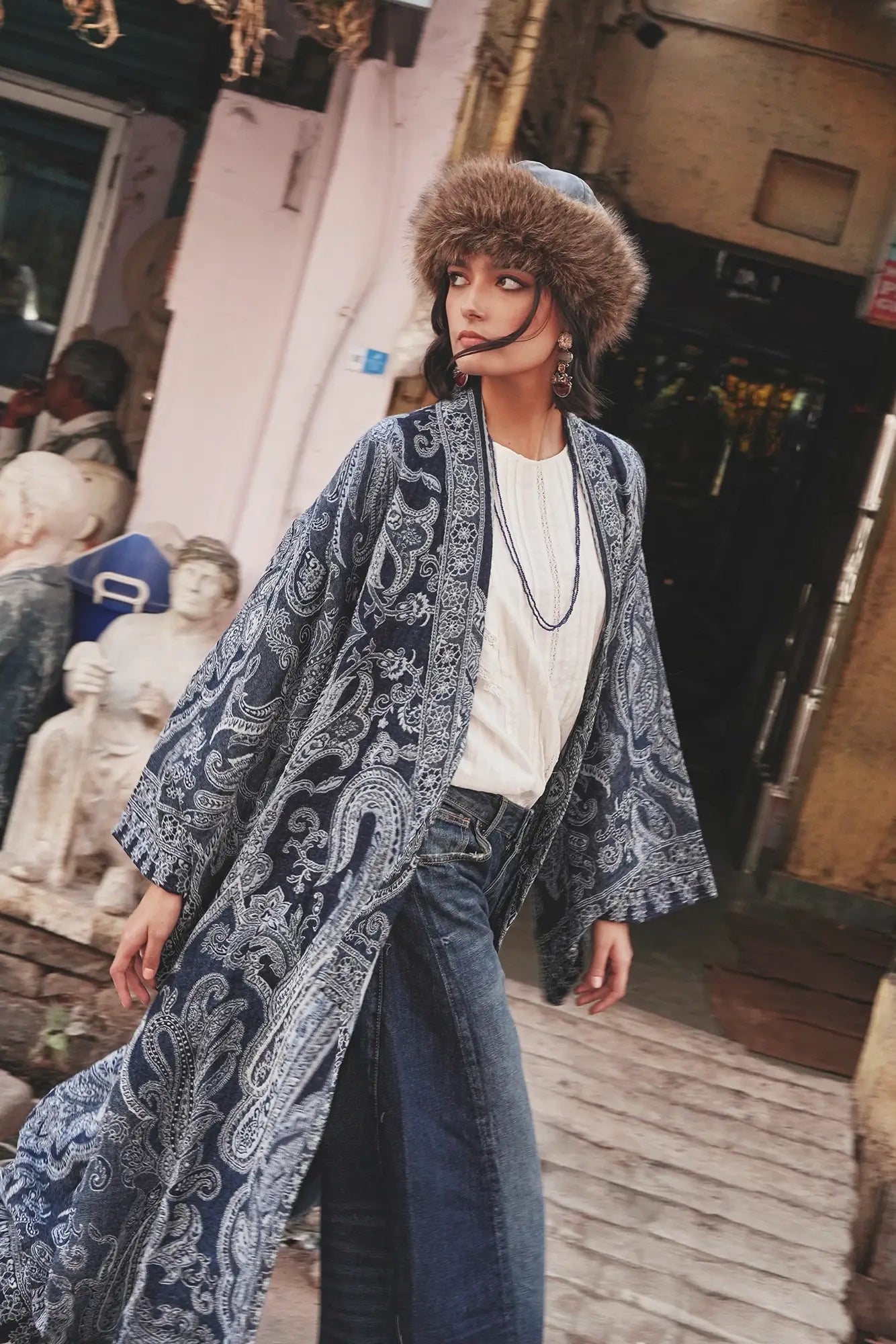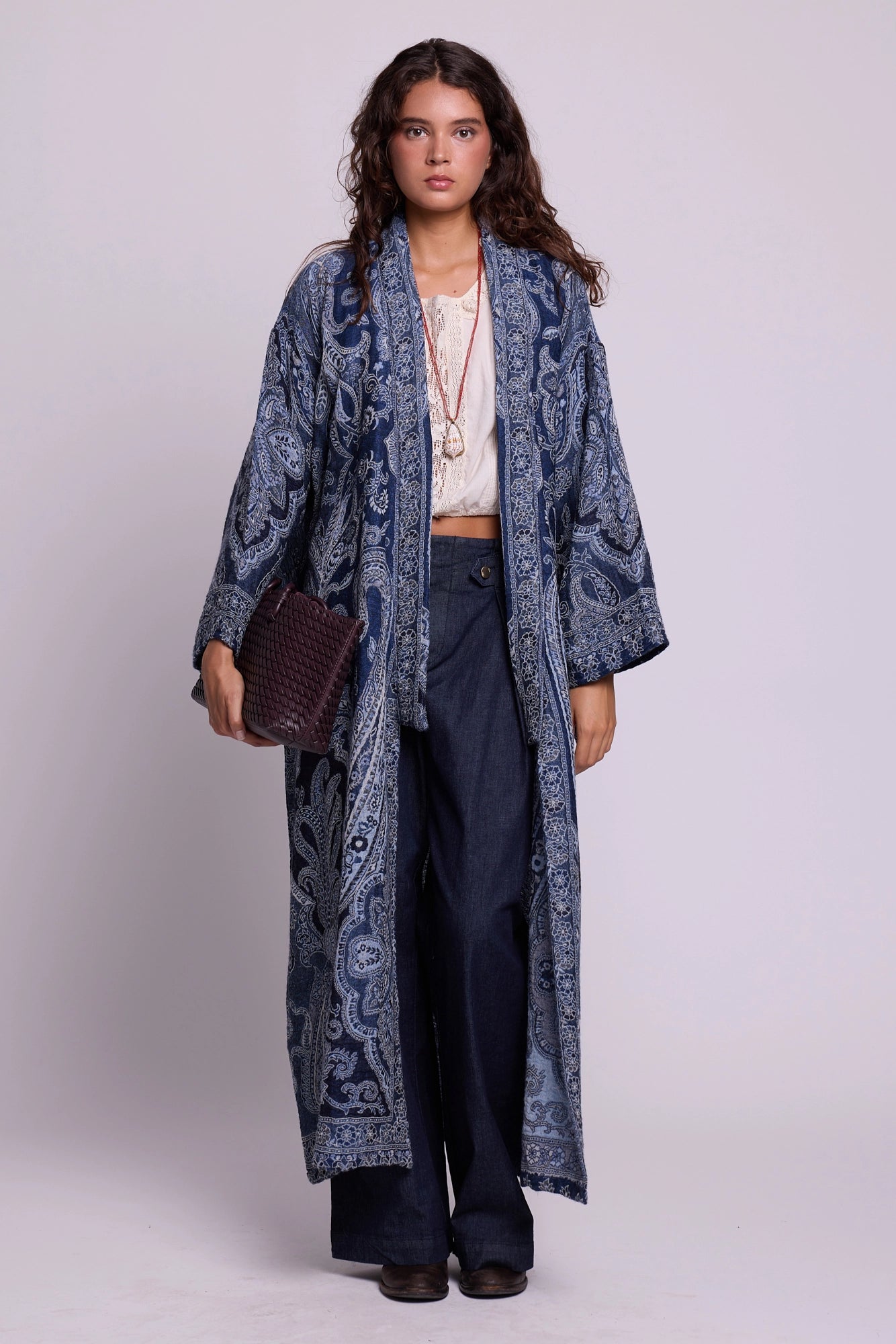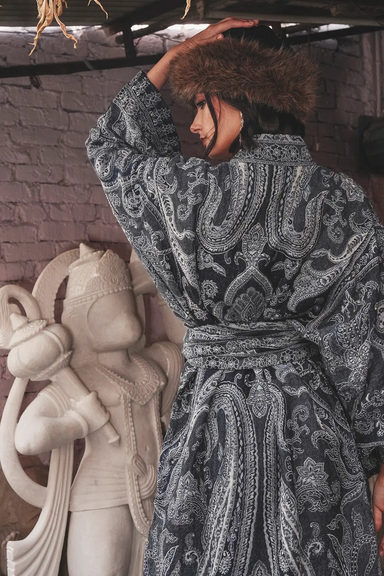 The Blue Paisley Kimono Coat, crafted from a pure wool shawl, is a celebration of refinement. Cloaked in deep indigo blues with intricate paisley detailing, it mirrors the serenity of twilight skies. Its fluid cut add understated drama, while the natural warmth of wool makes it both practical and elegant. A timeless piece that fuses heritage with modern luxury.