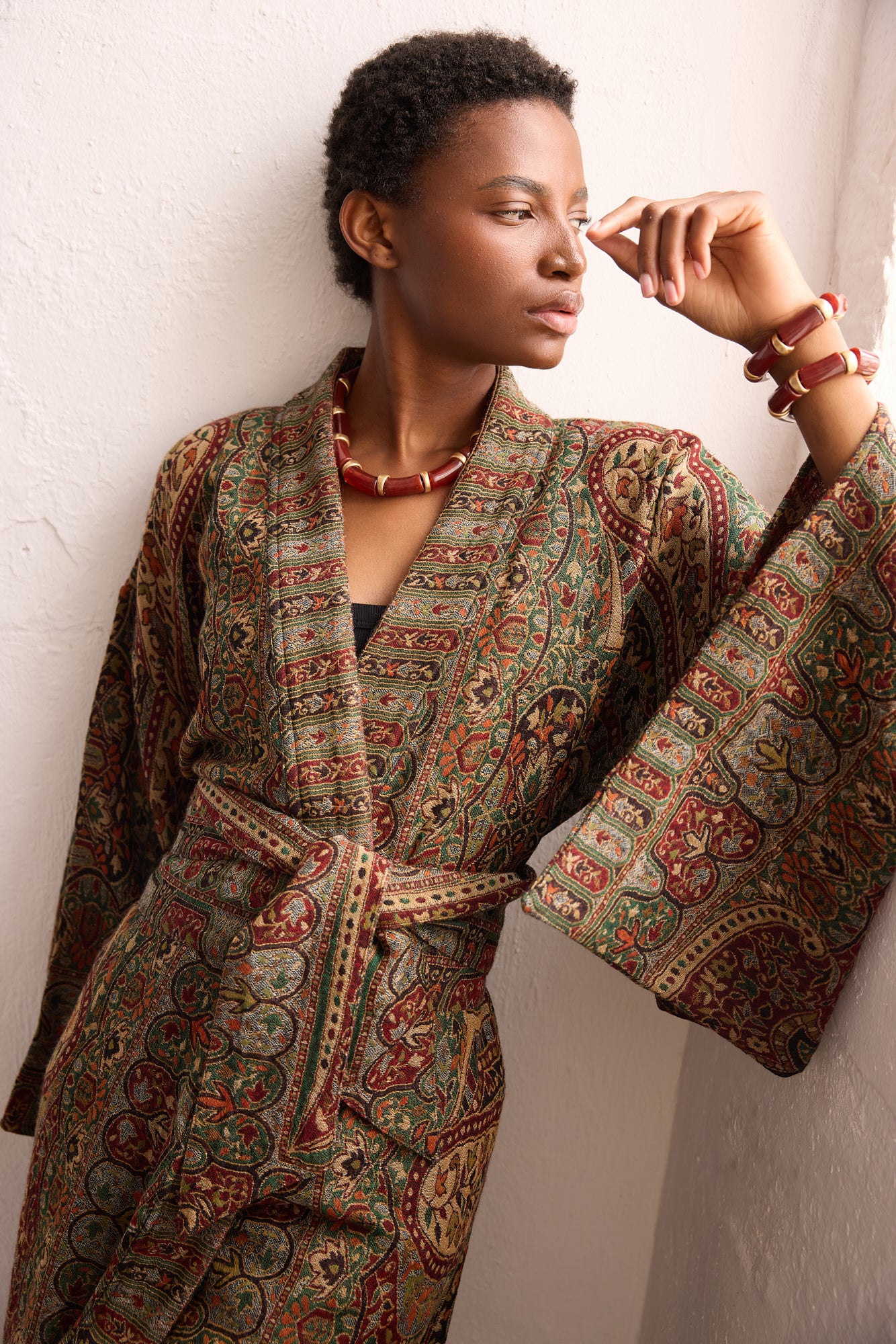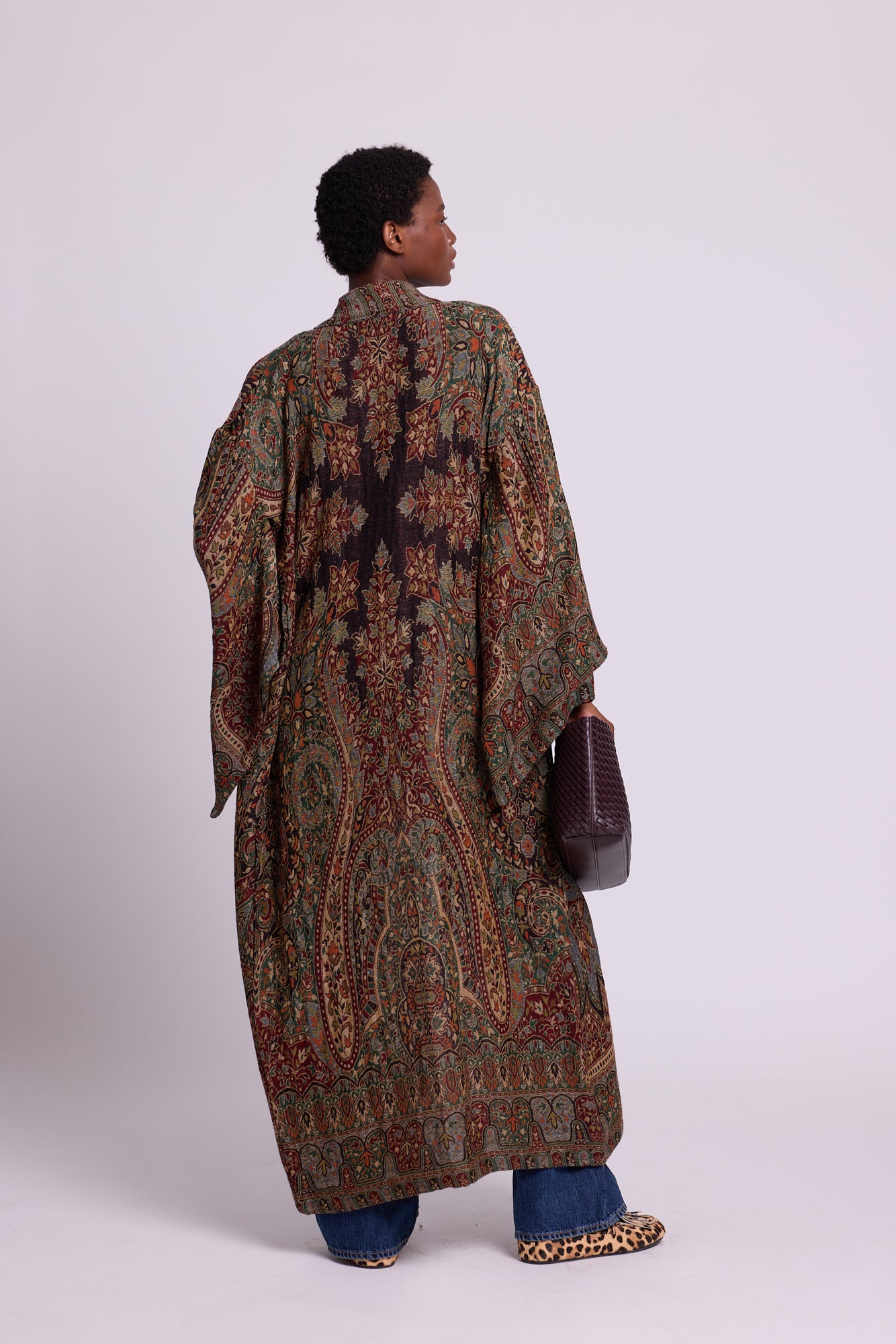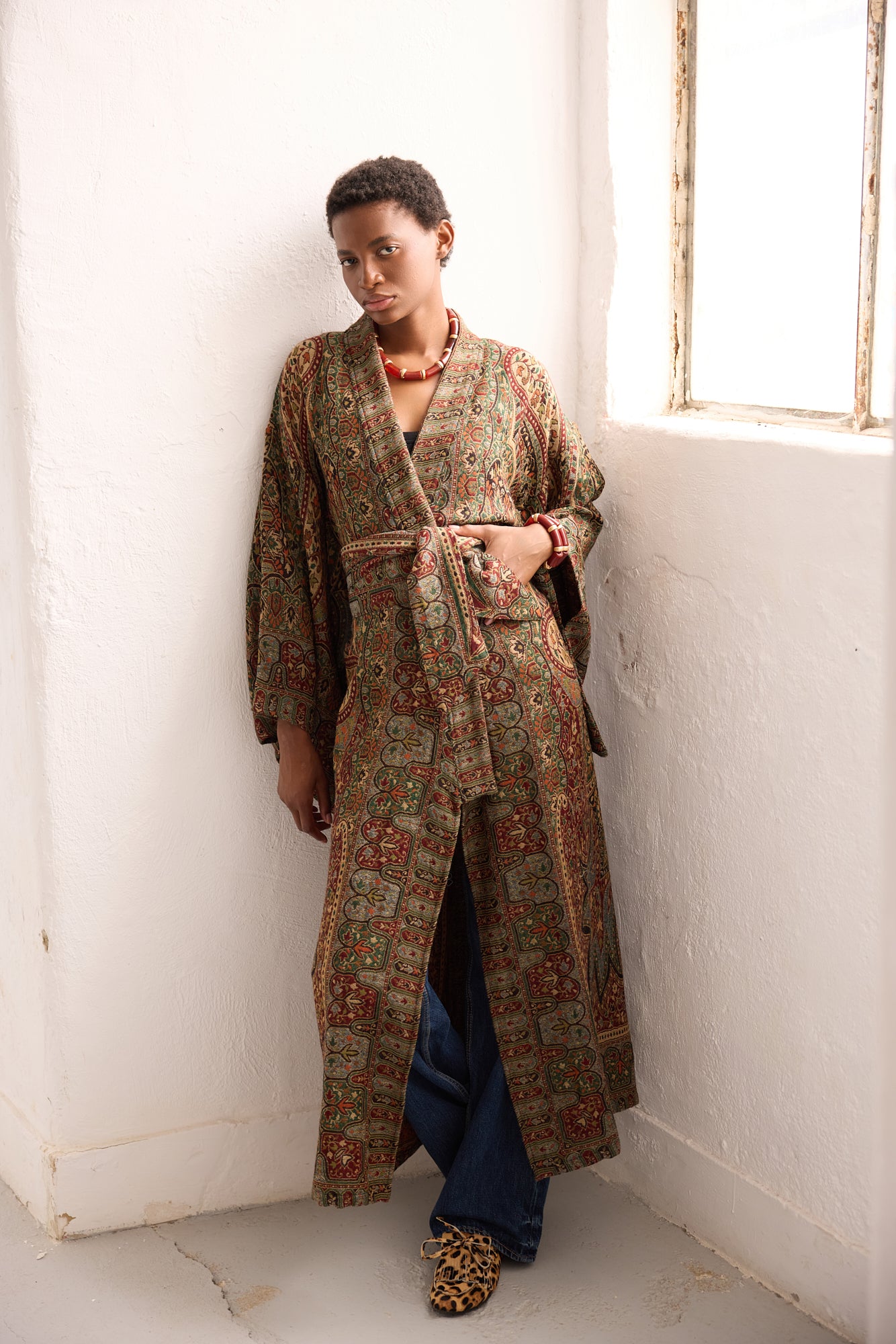 Crafted from a pure wool shawl, the Autumn Paisley Kimono Coat envelopes you in warmth and artistry. Its paisley pattern in earthy reds, greens and burnished golds evokes the richness of autumn leaves in motion. With its flowing silhouette, wide sleeves and belted waist, this piece brings effortless sophistication to both city strolls and fireside evenings.