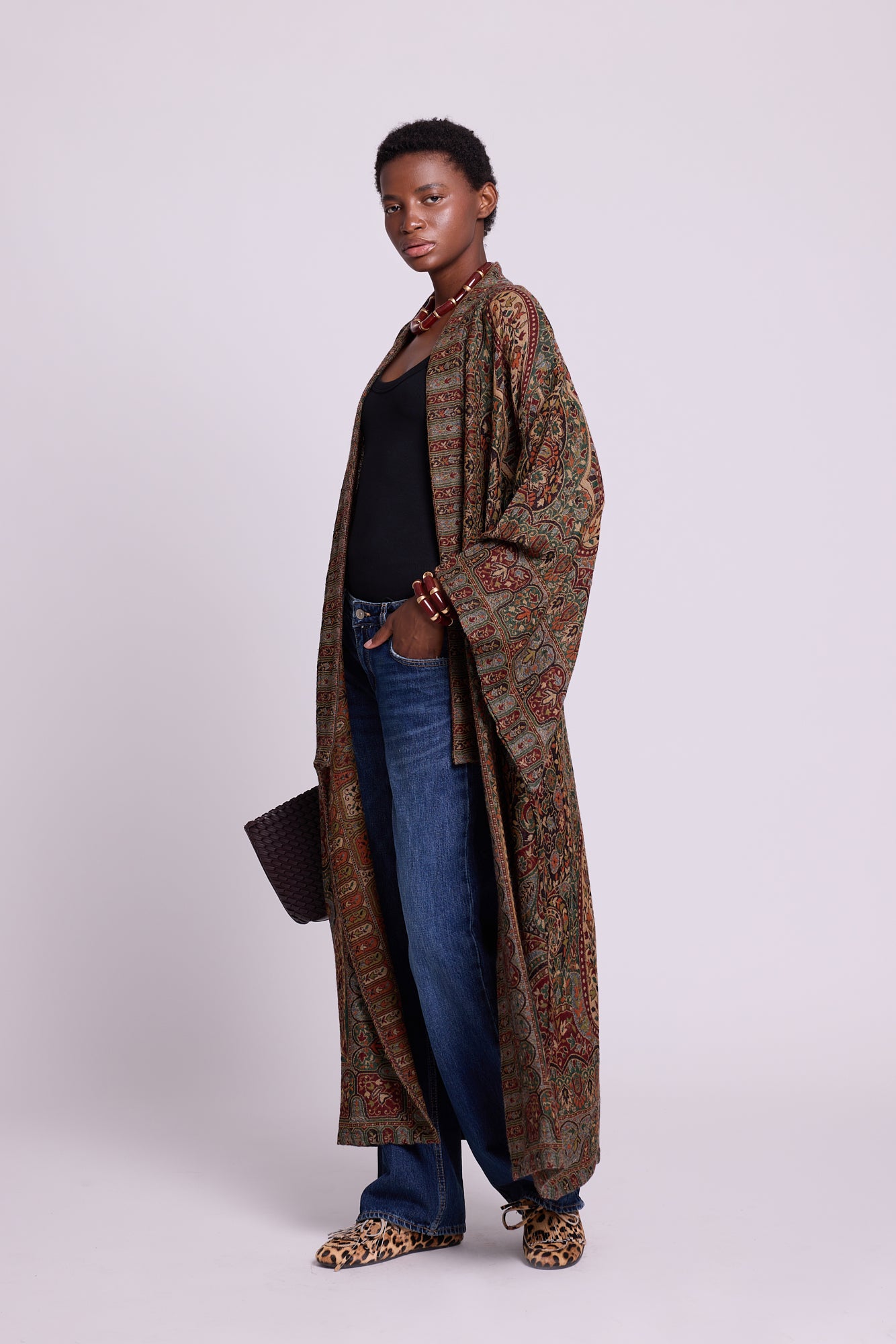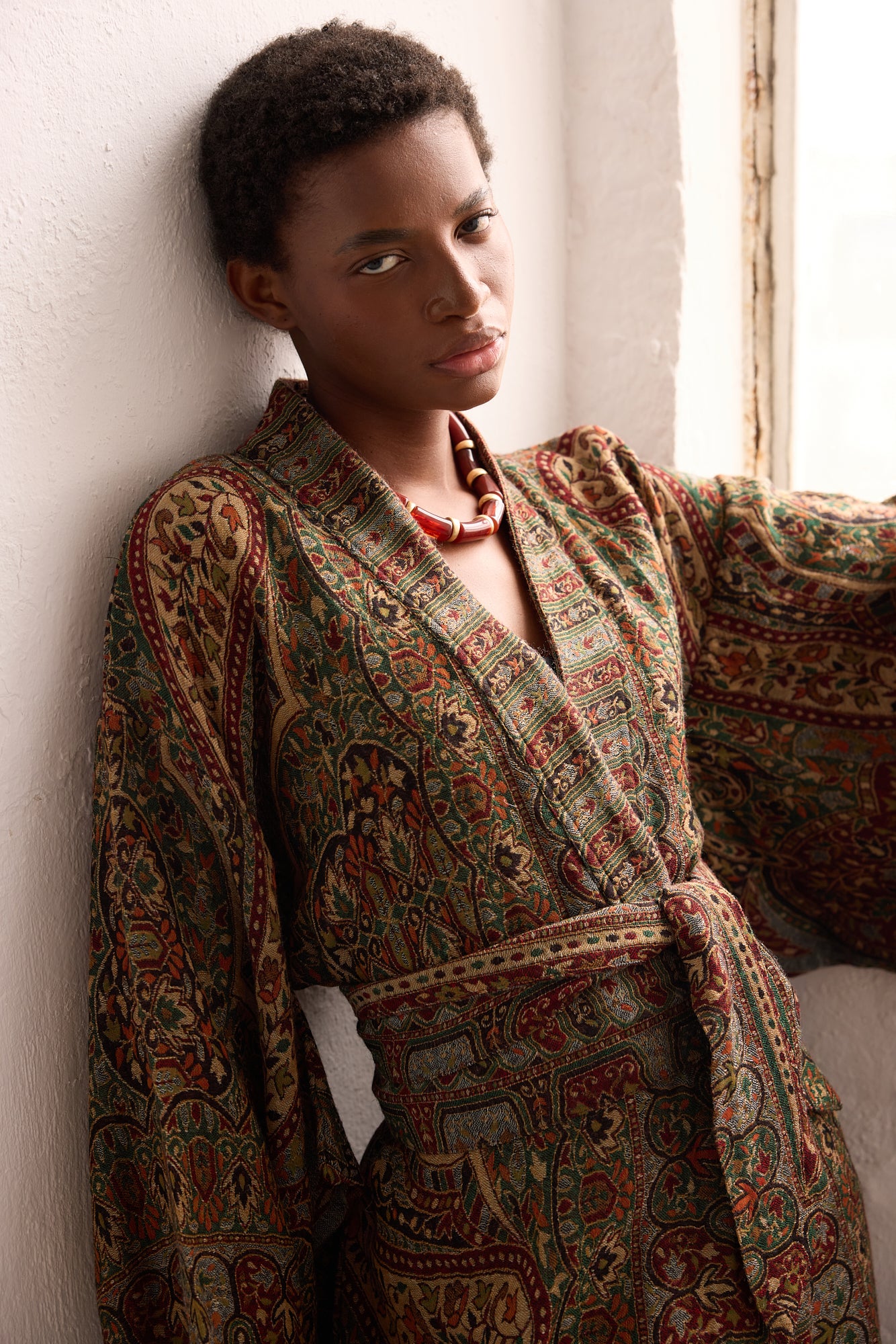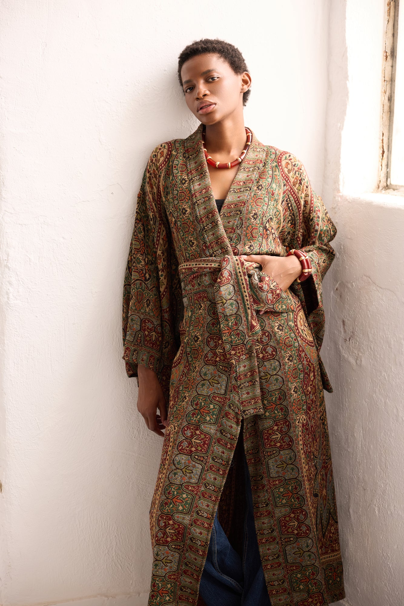 Crafted from a pure wool shawl, the Autumn Paisley Kimono Coat envelopes you in warmth and artistry. Its paisley pattern in earthy reds, greens and burnished golds evokes the richness of autumn leaves in motion. With its flowing silhouette, wide sleeves and belted waist, this piece brings effortless sophistication to both city strolls and fireside evenings.