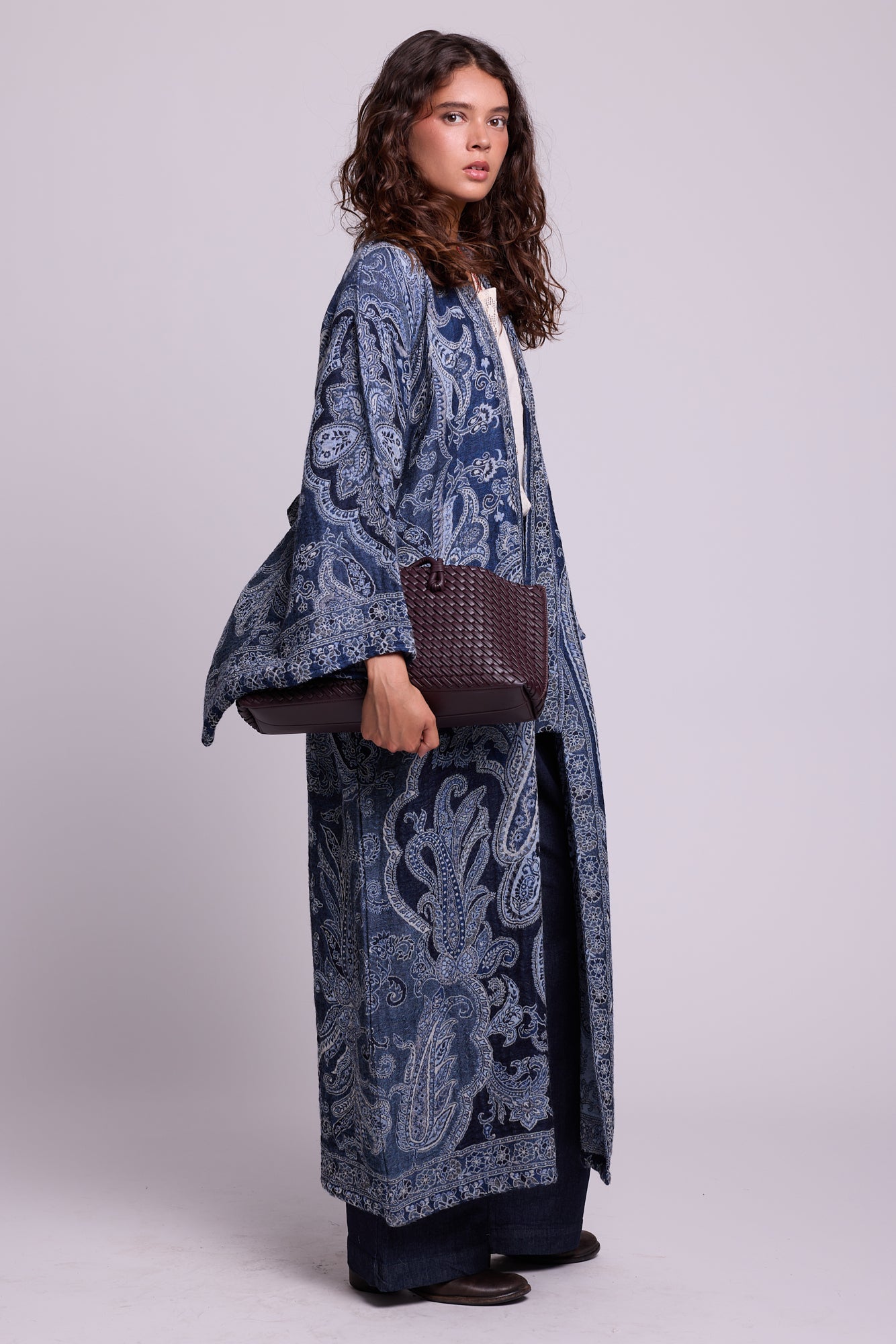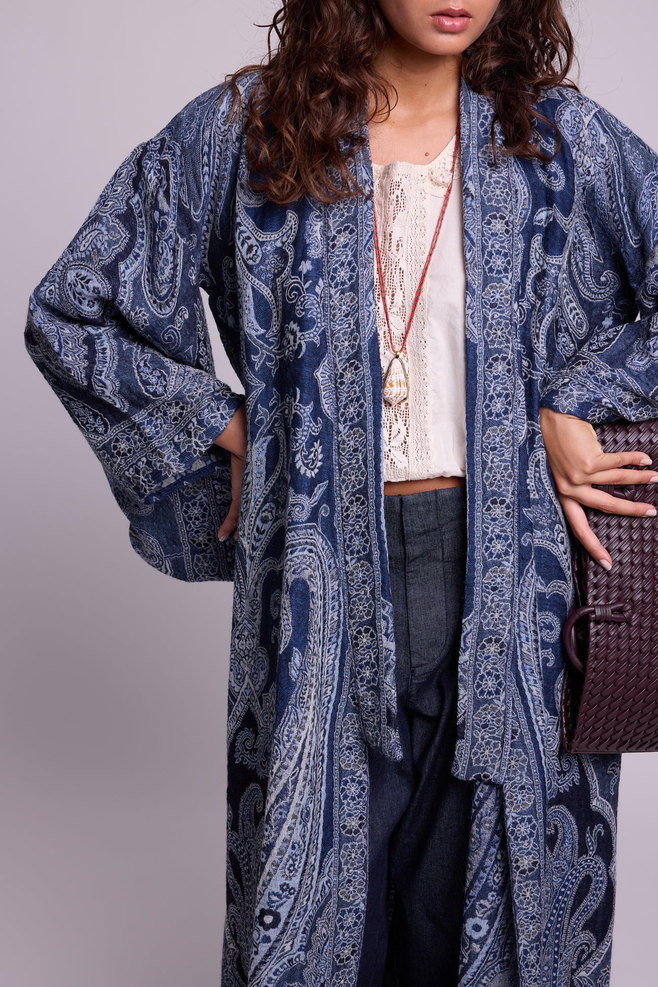 The Blue Paisley Kimono Coat, crafted from a pure wool shawl, is a celebration of refinement. Cloaked in deep indigo blues with intricate paisley detailing, it mirrors the serenity of twilight skies. Its fluid cut add understated drama, while the natural warmth of wool makes it both practical and elegant. A timeless piece that fuses heritage with modern luxury.
