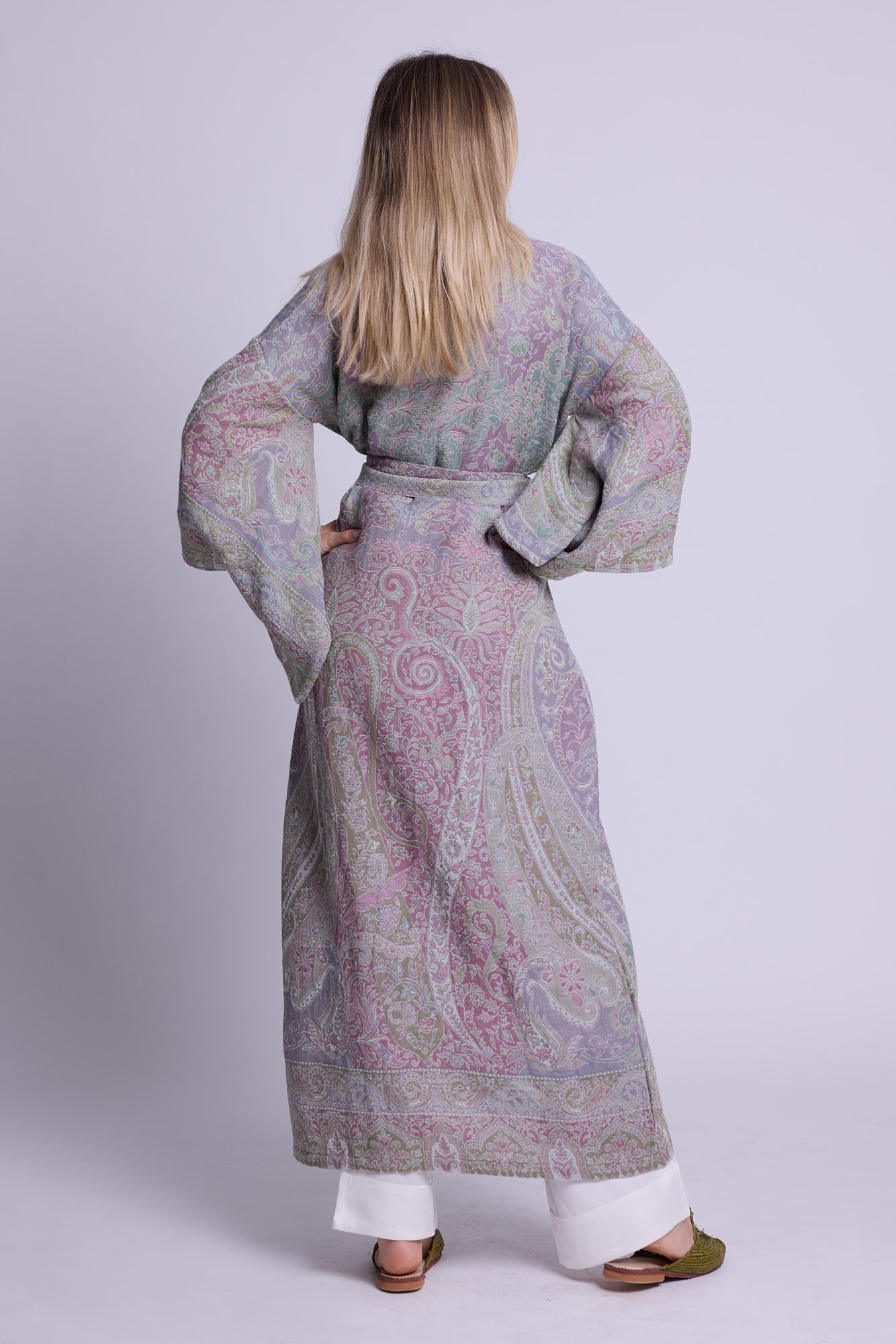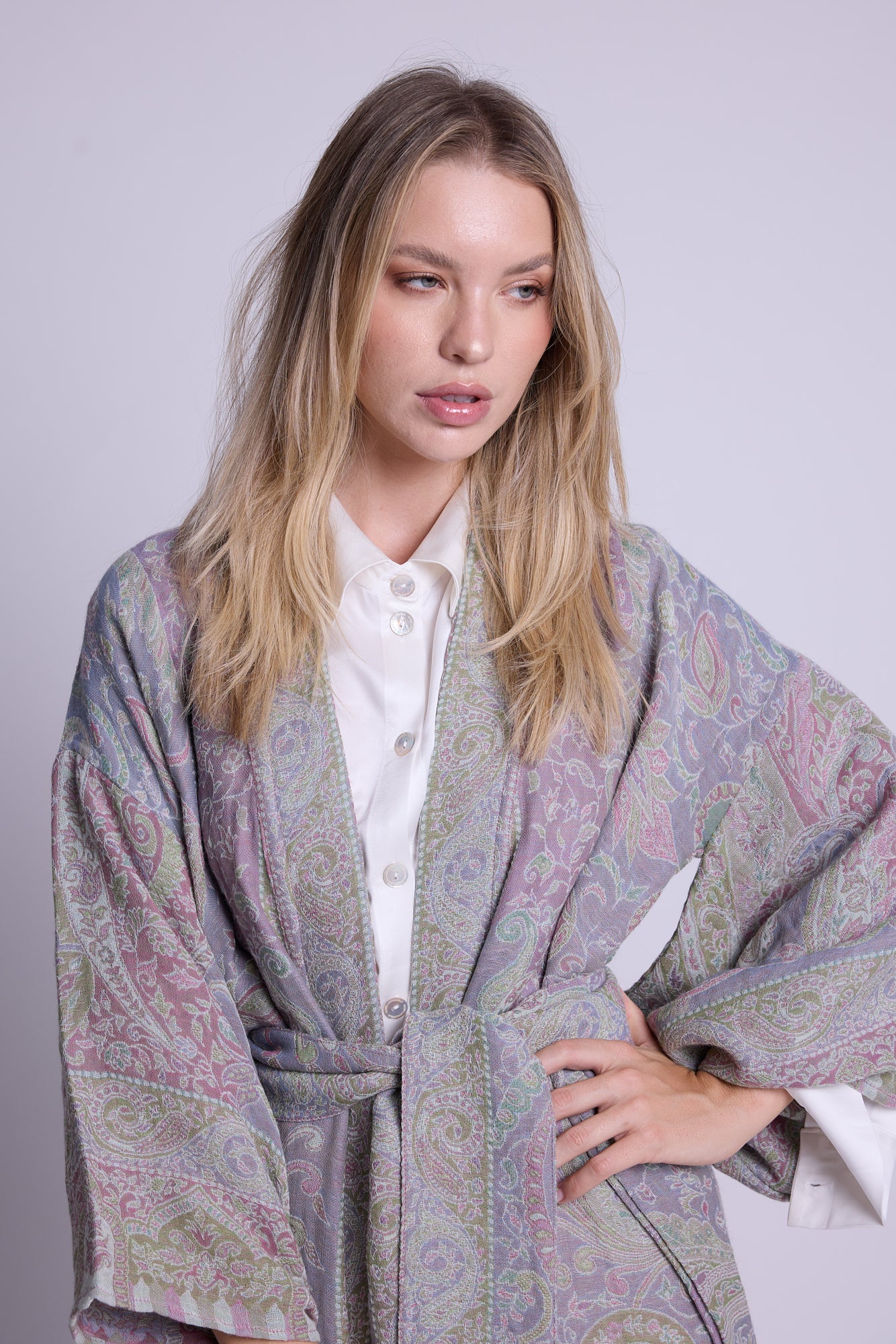 An exquisite celebration of timeless artistry and contemporary elegance. Crafted from a sumptuous lilac and sage paisley weave, this kimono coat drapes effortlessly, enveloping the silhouette in soft, fluid movement. The intricate patterning evokes a sense of vintage opulence, while the relaxed, kimono-style cut lends it a distinctly modern, bohemian spirit.