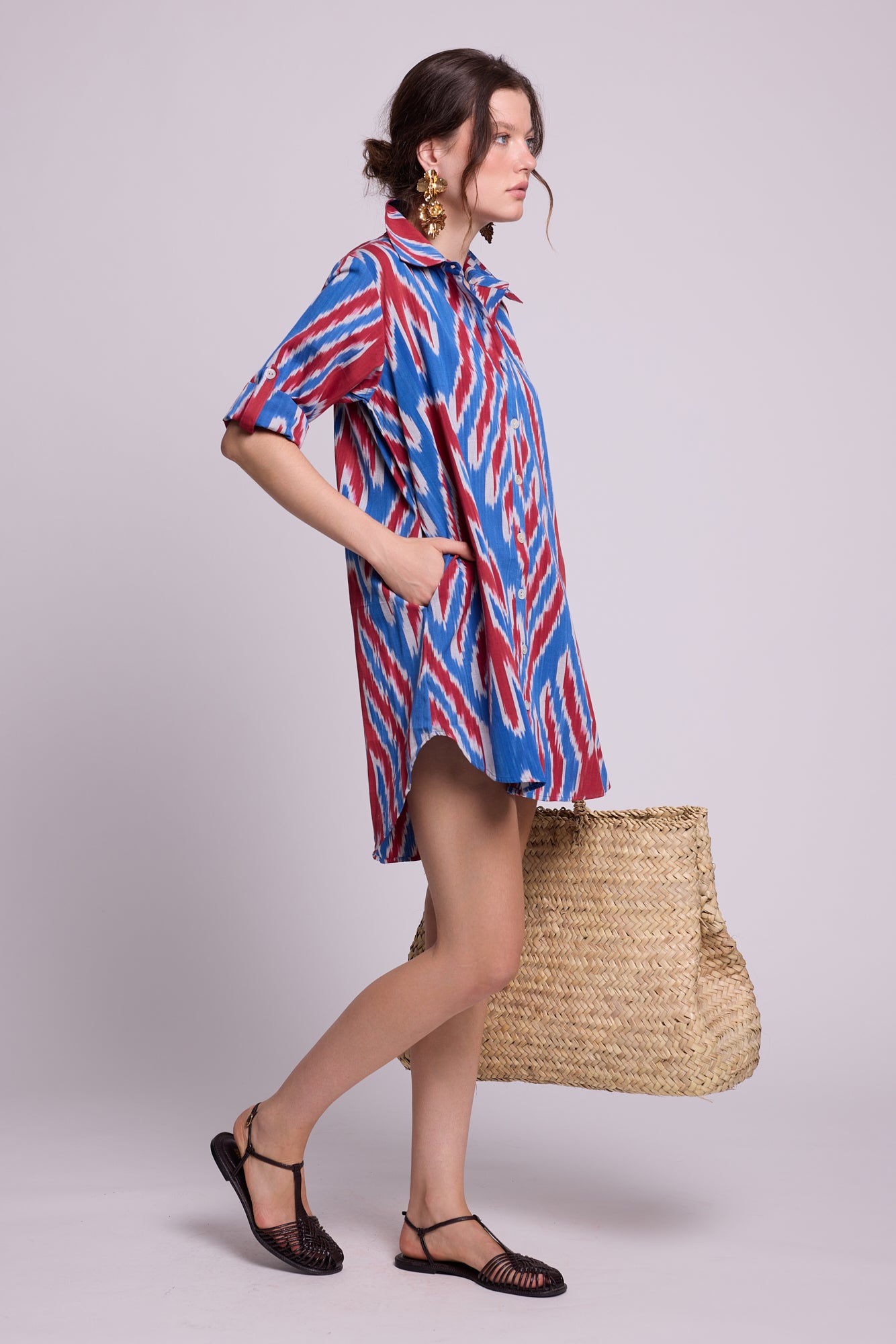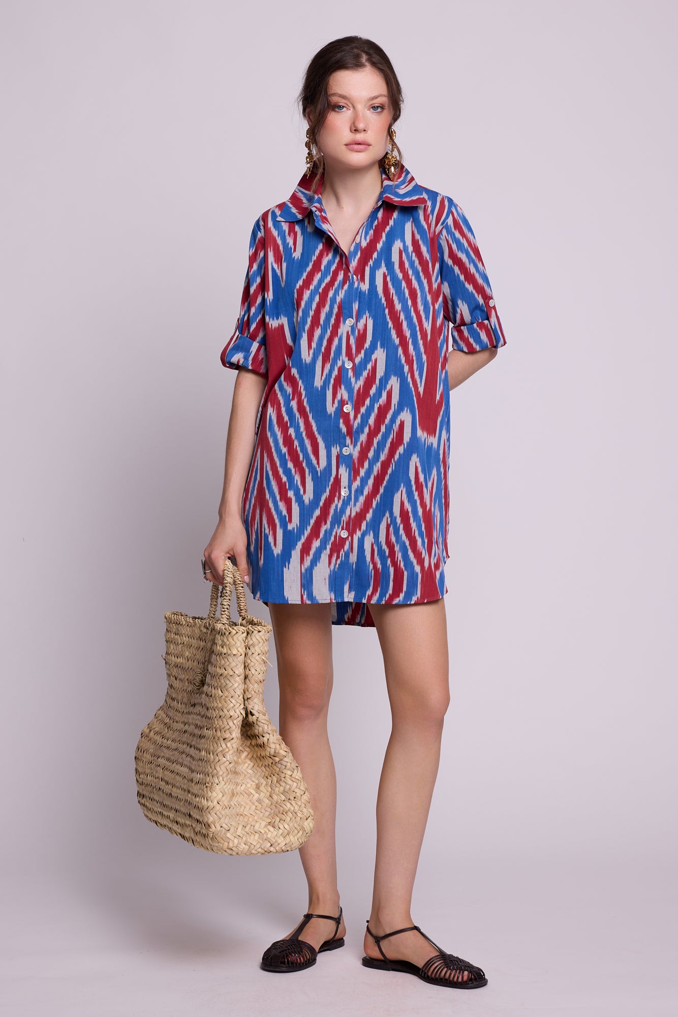 A celebration of heritage craftsmanship and effortless elegance, the Scarlet Leafs Chemisier is the versatile counterpart to our beloved Bikaner Maxi Dress. Handloomed from the same luxurious pure cotton ikat, this standout piece showcases the bold scarlet red and cornflower blue Uzbekistan-inspired pattern — a striking, vintage-inflected design that speaks to timeless artistry.