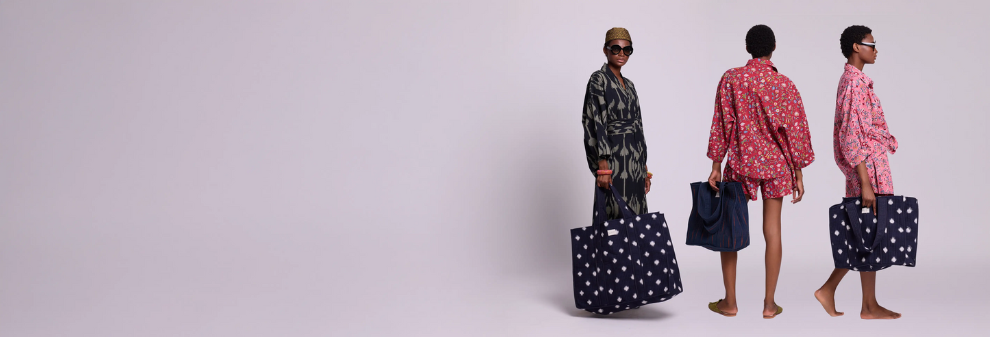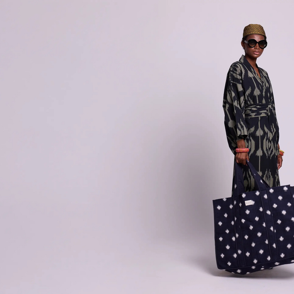 From quilted cotton totes to computer bags and weekend bags, every item is handcrafted using our iconic ikat fabrics – a tribute to traditional techniques and modern versatility. Designed to pair perfectly with our clothing collections, these sustainable accessories bring practicality, elegance, and a sense of harmony to your everyday wardrobe.