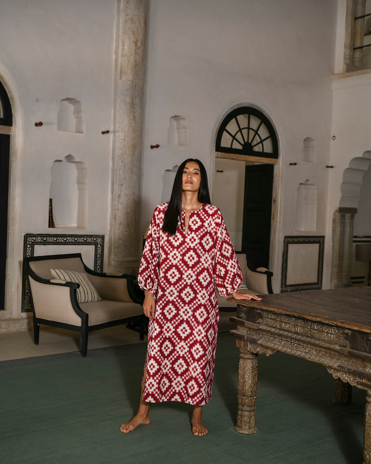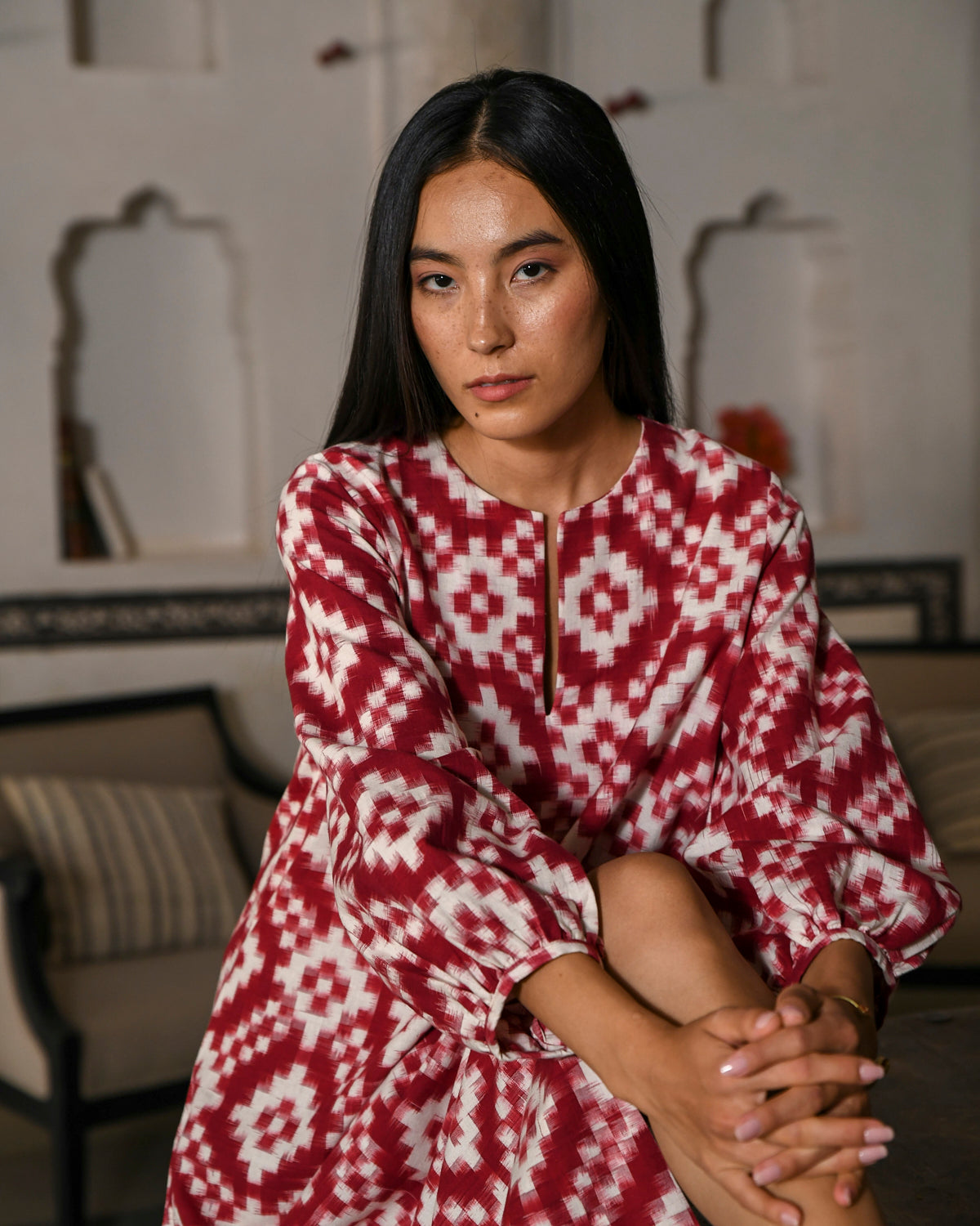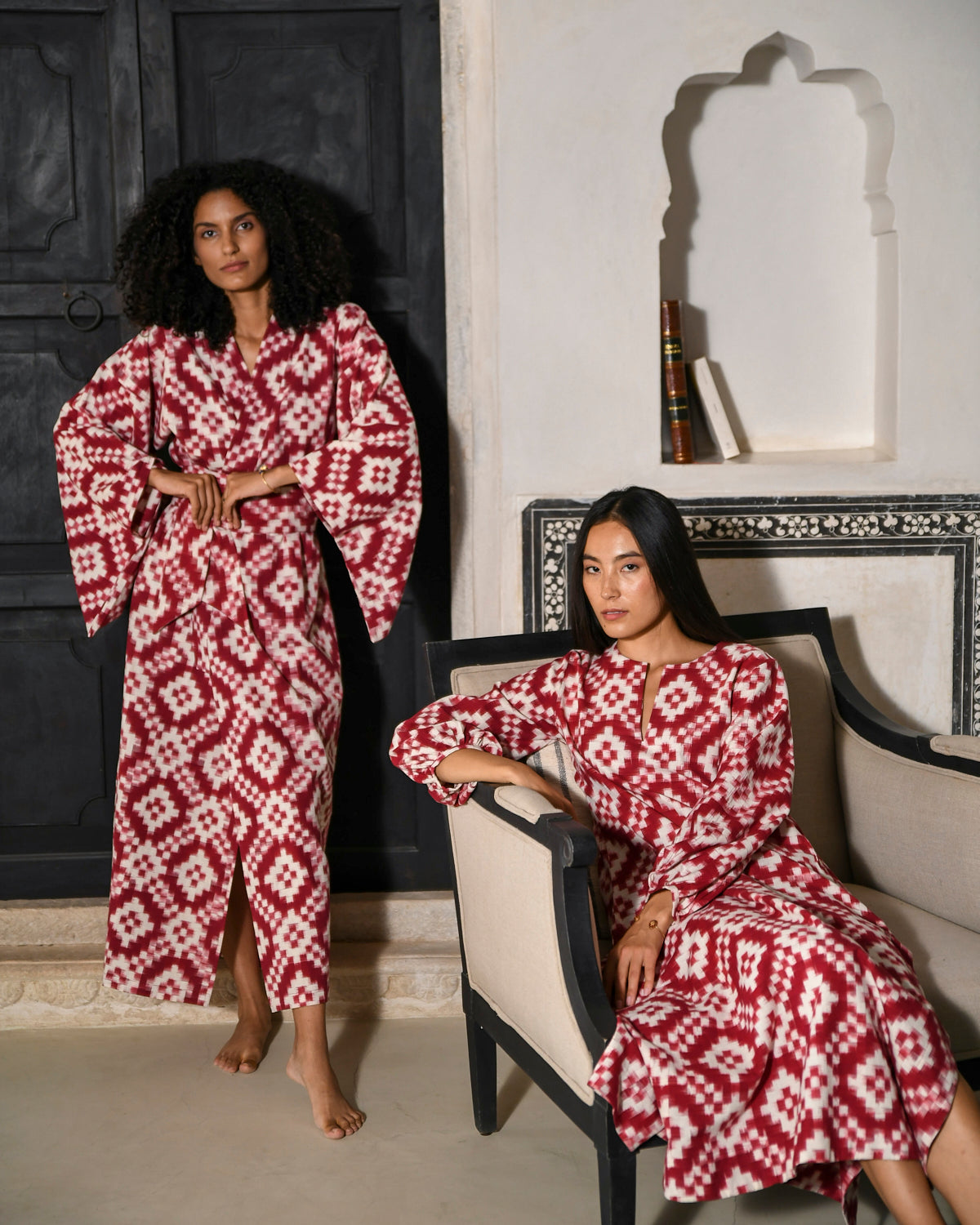 The Dorcas Red Kaftan by KLEED is a best-selling statement piece, featuring bold geometric red and white patterns that transition effortlessly from day to night. Handwoven from pure cotton by skilled artisans using ancestral ikat techniques, this slow fashion kaftan supports small artisan communities and honors traditional craftsmanship. Ethically made and truly unique, the Dorcas Red Kaftan embodies KLEED’s commitment to sustainable luxury and timeless style—perfect for resort escapes, elegant lounging, or standout summer events.
