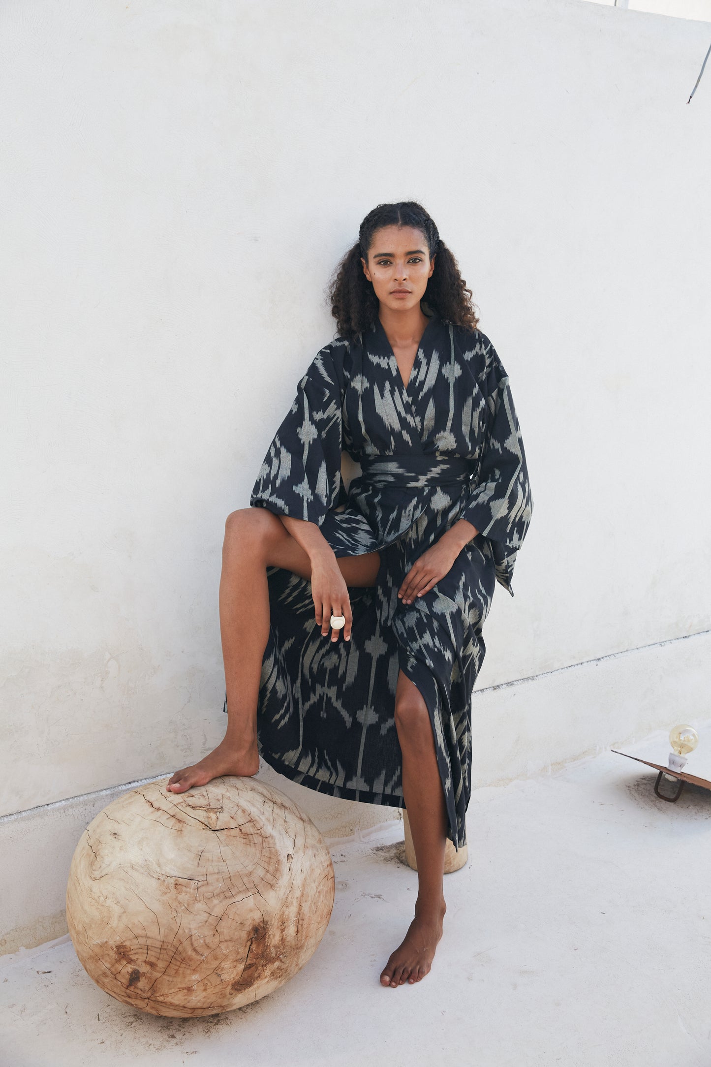 Each Congo Naya Kimono is handcrafted from 100% cotton by artisan communities using ancient ikat weaving techniques. The yarns are resist-dyed, hand-twirled, and meticulously loomed to create the kimono’s soft, shaded texture—honoring generations of craftsmanship.