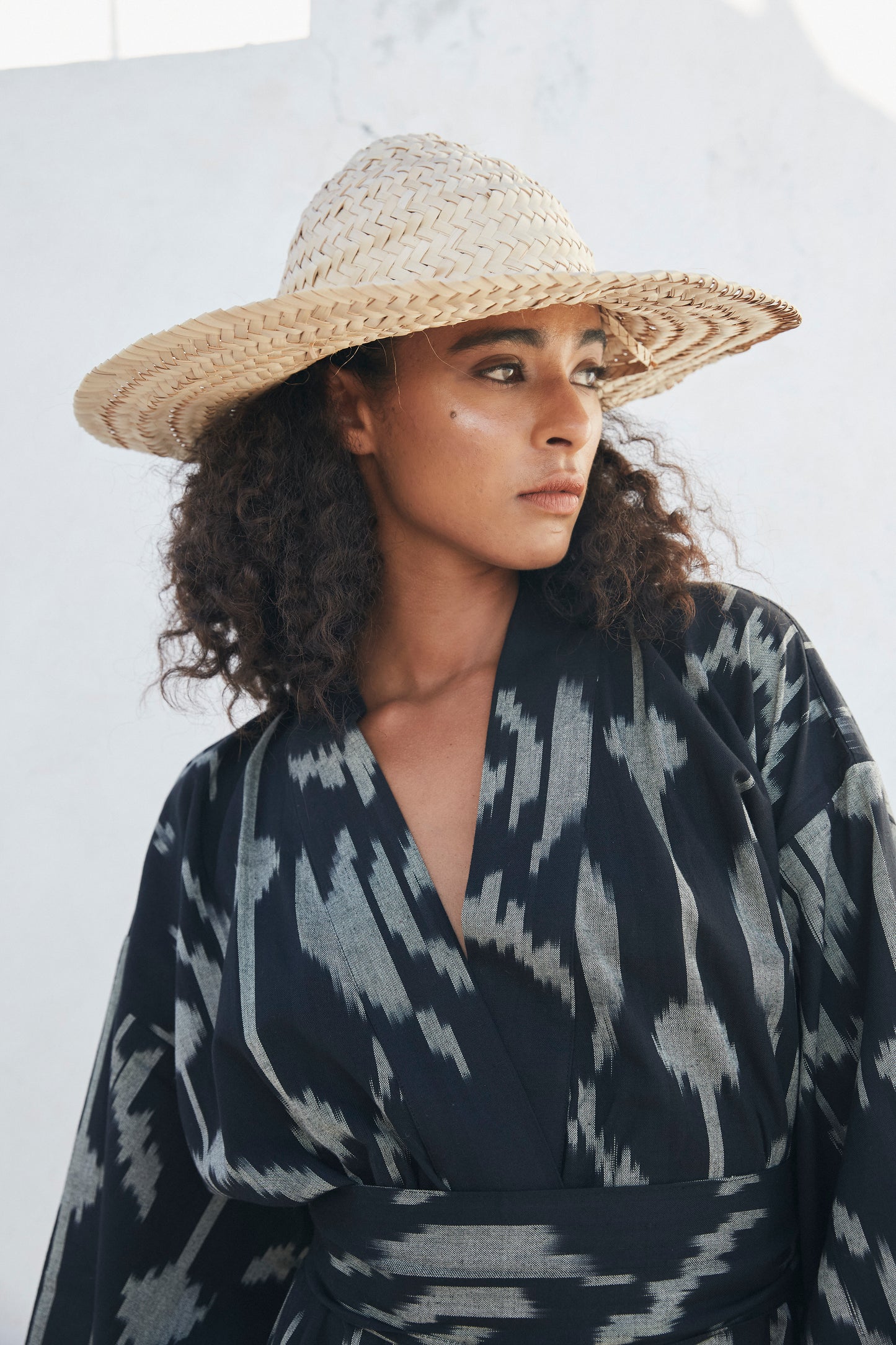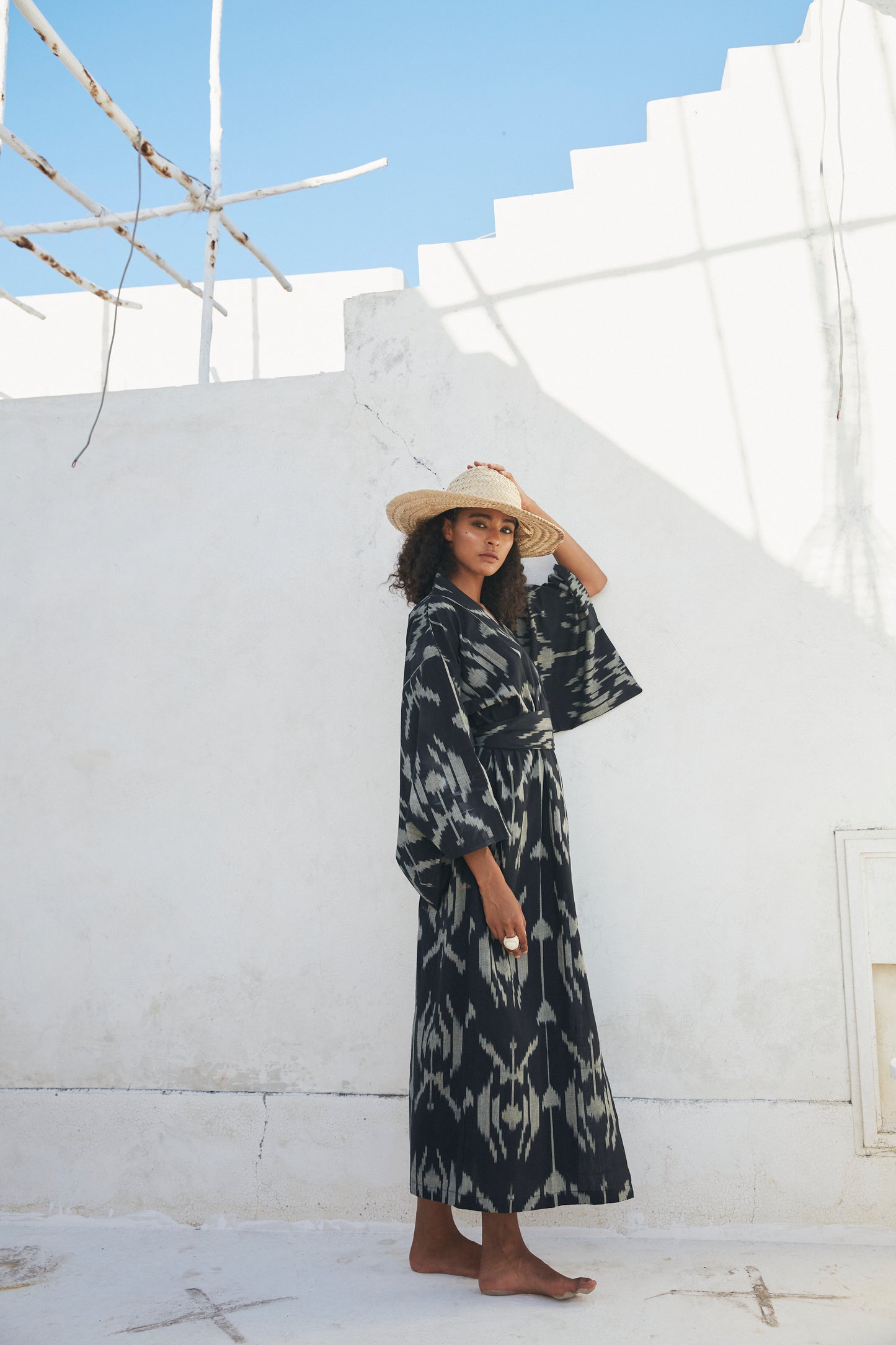 Unleash your inner elegance with the Congo Naya Kimono by Kleed—a sleek, jungle-inspired piece that effortlessly blends sophistication with bold artistry. Its distinctive tan-on-black ikat pattern lends a refined, modern edge, making it the perfect choice for both daytime ease and elevated evening occasions.