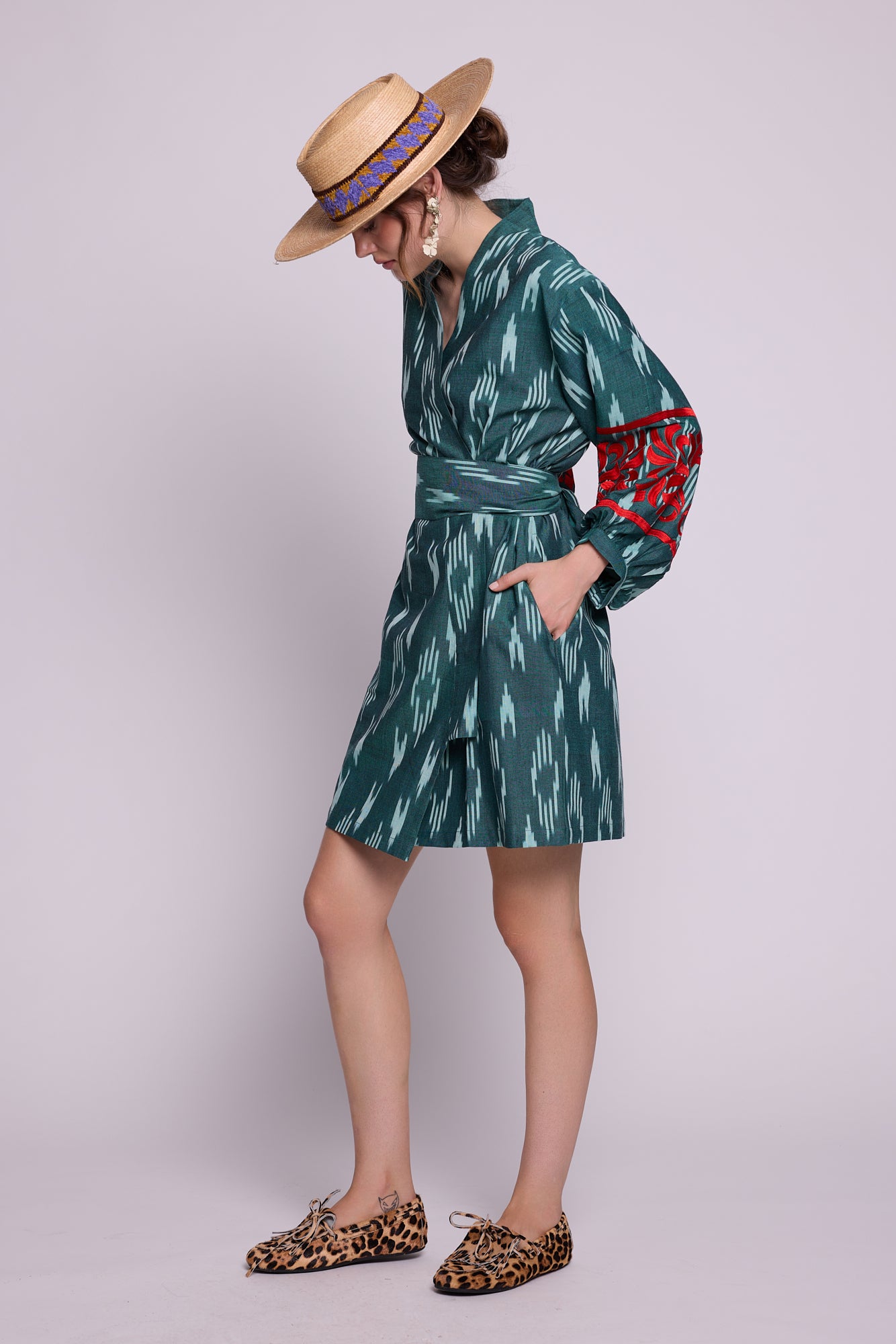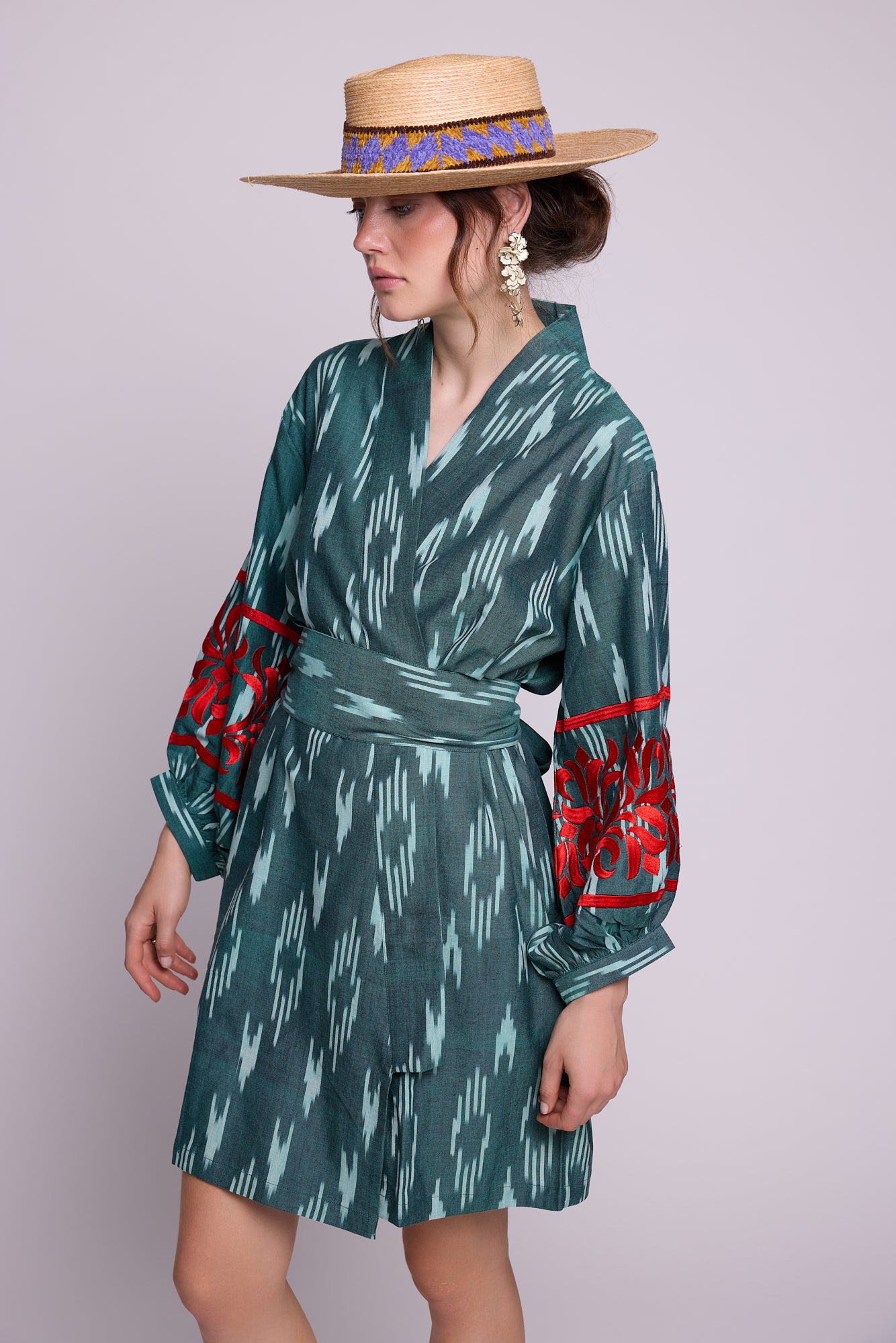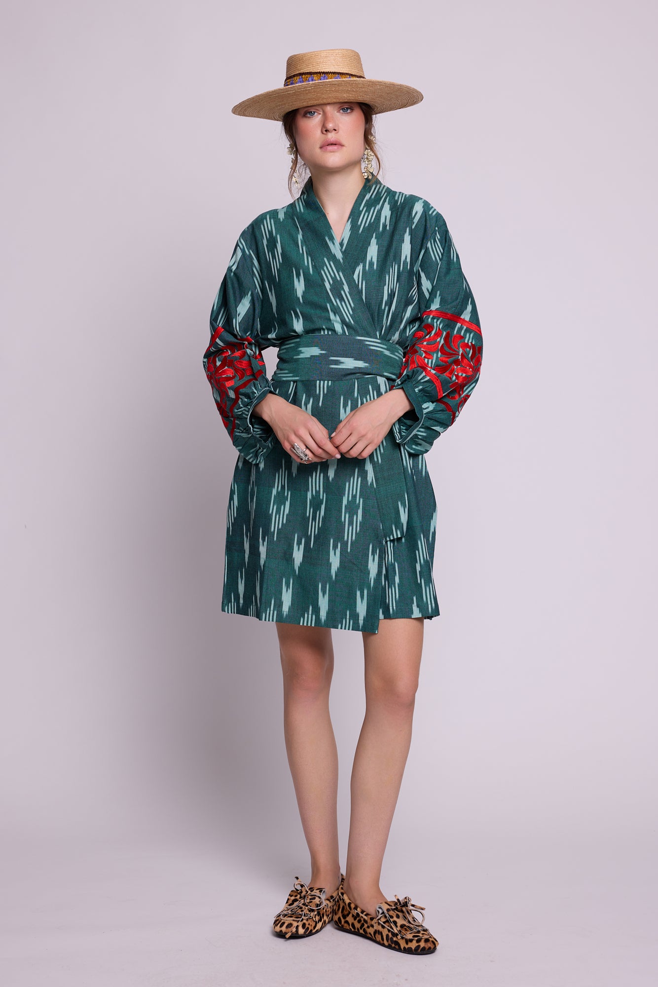 With its feminine gathered balloon sleeves and striking silhouette, the Zimbabwe Kandy Short Kimono brings effortless style to summer dressing. Made from handloomed pure ikat cotton in a rich vintage dark green, it features a slashed contrasting pattern that makes a bold yet timeless statement.