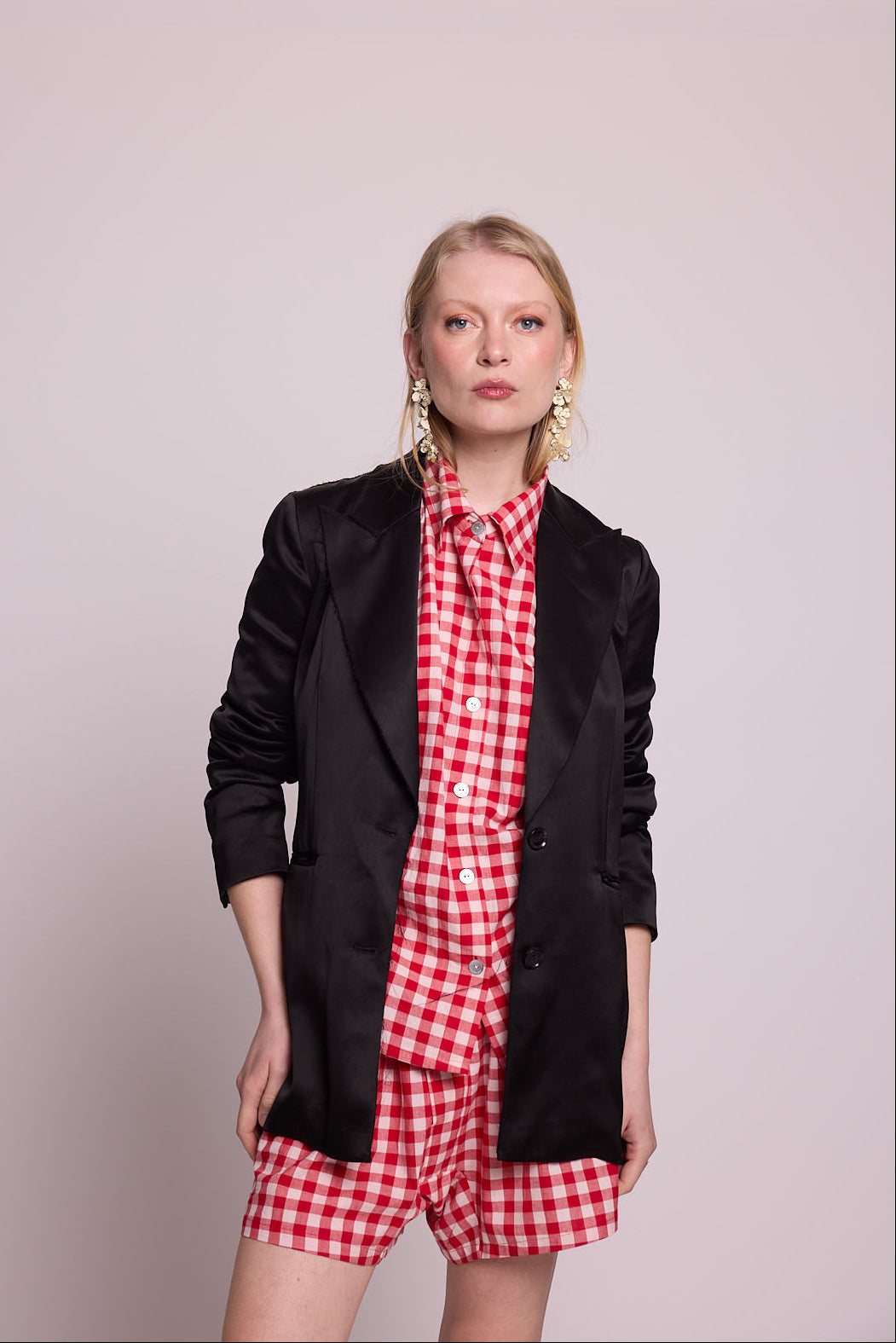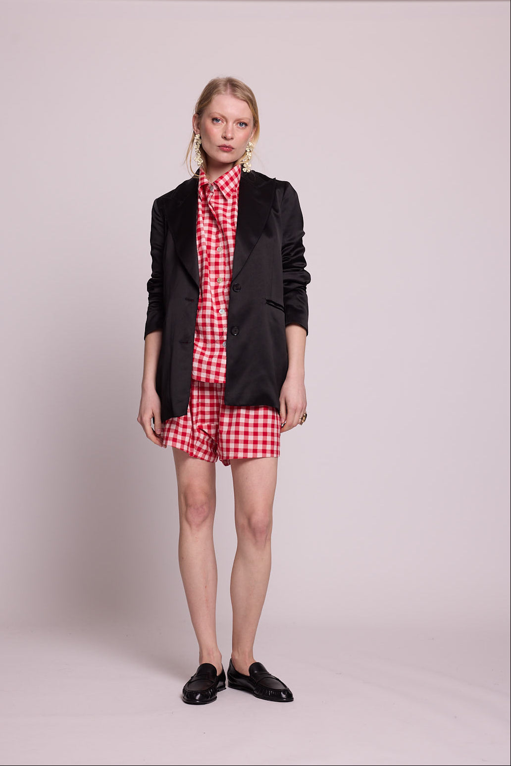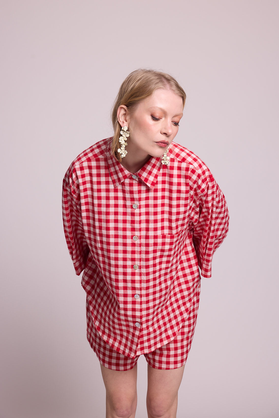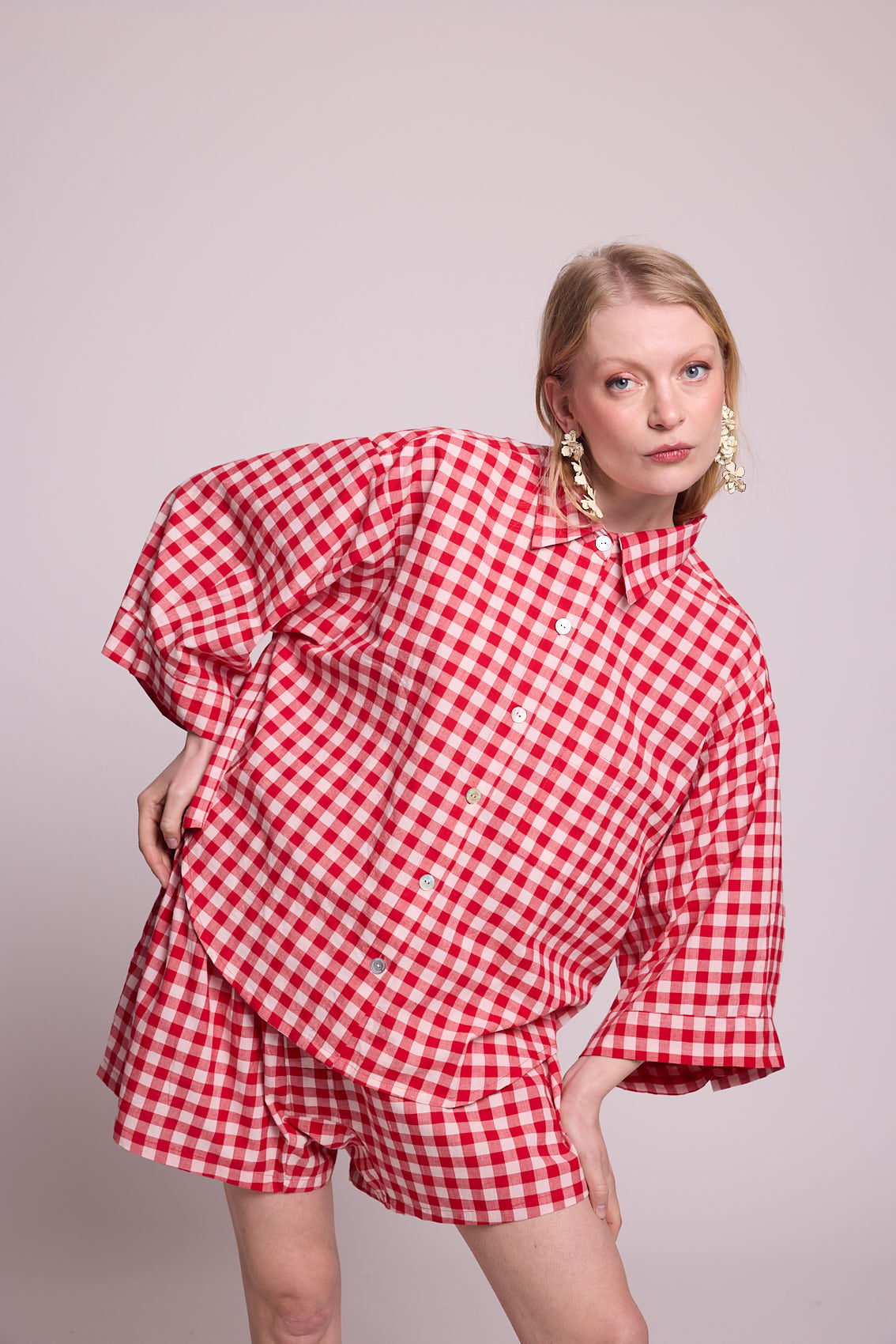 A modern ode to classic checks — bold, effortless and undeniably chic. Crafted from soft cotton in a vibrant red vichy pattern, the Bhati Red Pyjama Set combines relaxed tailoring with a clean, contemporary silhouette. The oversized shirt features dropped shoulders and wide cuffs, creating an easy elegance that feels both timeless and fresh.
