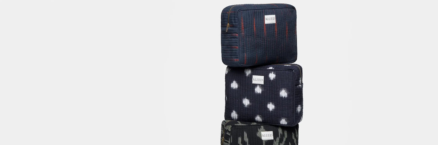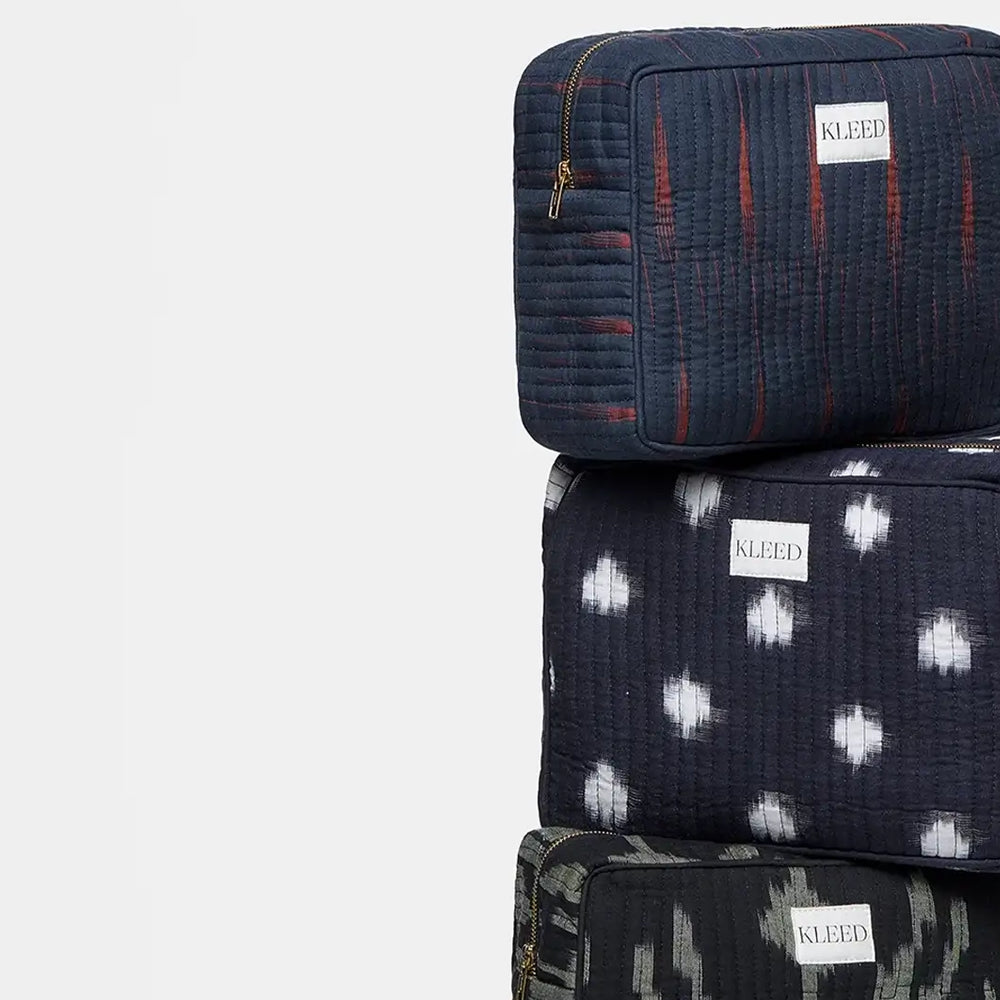 Crafted from quilted ikats and hand block-printed fabrics, our new pouches are both stylish and sustainable. Each one is handmade by artisans using upcycled surplus from our collections — turning leftover fabrics into functional, beautiful accessories. Lined and zippered, they're perfect for your SPFs, beauty items, or everyday essentials. Use them at the beach, on weekends away, or inside your favourite tote. Designed to match our robes and kimonos, these pouches complete your slow fashion look with purpose and charm.