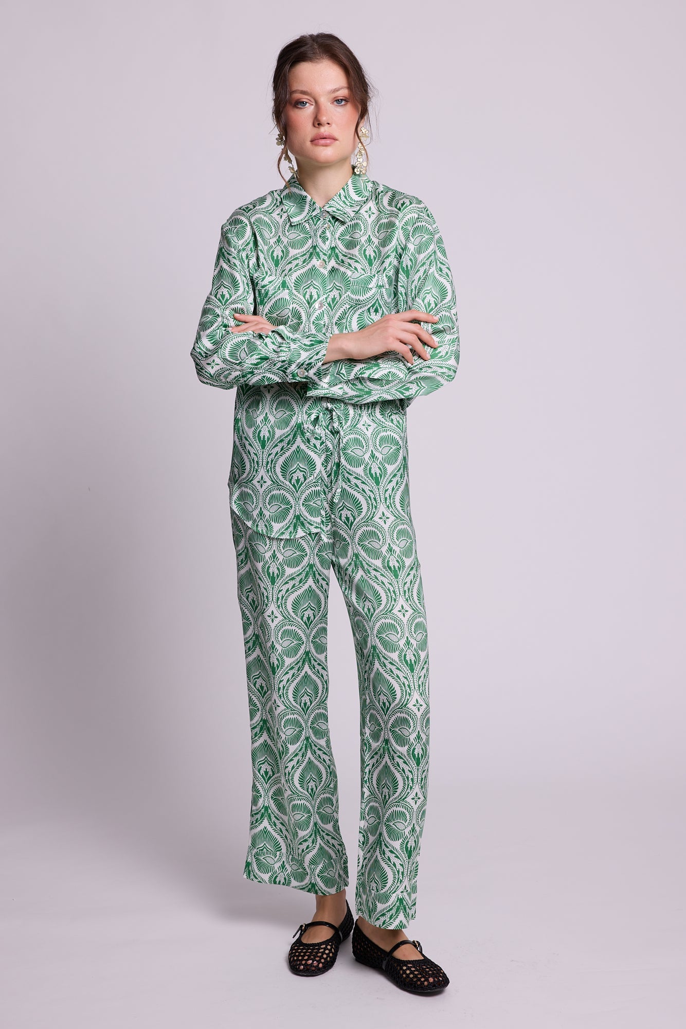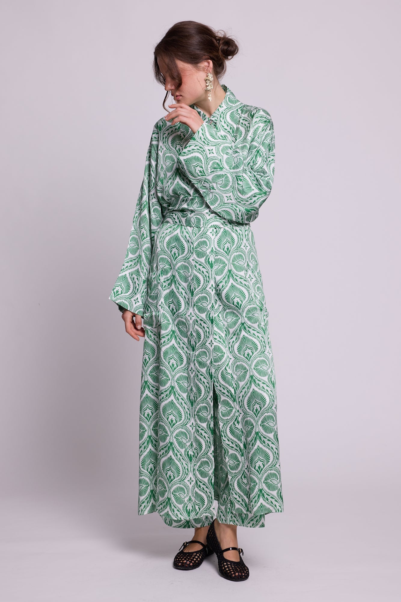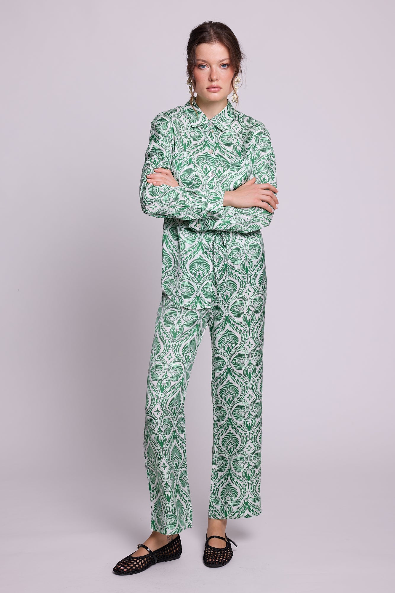 Infuse your wardrobe with a touch of whimsy with KLEED’s 100% Viscose Green Cornucopia Print Set. Made from ultra-soft, breathable viscose, this two-piece ensemble is designed for maximum comfort and elegance. The eye-catching cornucopia print, featuring a vibrant palette of greens and rich hues, brings a playful, artistic flair to your loungewear, making it perfect for both relaxing at home and casual outings.