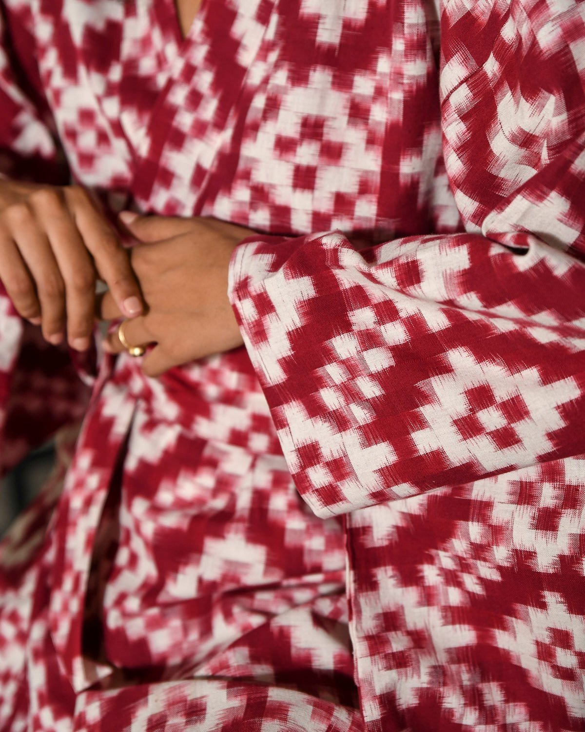 Experience the vibrant energy of the Mombasa Red Kimono by KLEED, one of our best sellers and a favorite among our community. This striking kimono features a symmetrical red-on-white ikat pattern, expertly handwoven from pure cotton by skilled artisans using ancestral techniques. The back is adorned with a stunning midnight blue crane embroidered in pure silk, symbolizing both exotic beauty and KLEED’s commitment to wildlife conservation. Ethically crafted as part of our slow fashion philosophy, each piece supports artisan communities and celebrates traditional craftsmanship. Perfect for luxury resort escapes, chic lounging, or statement summer style.